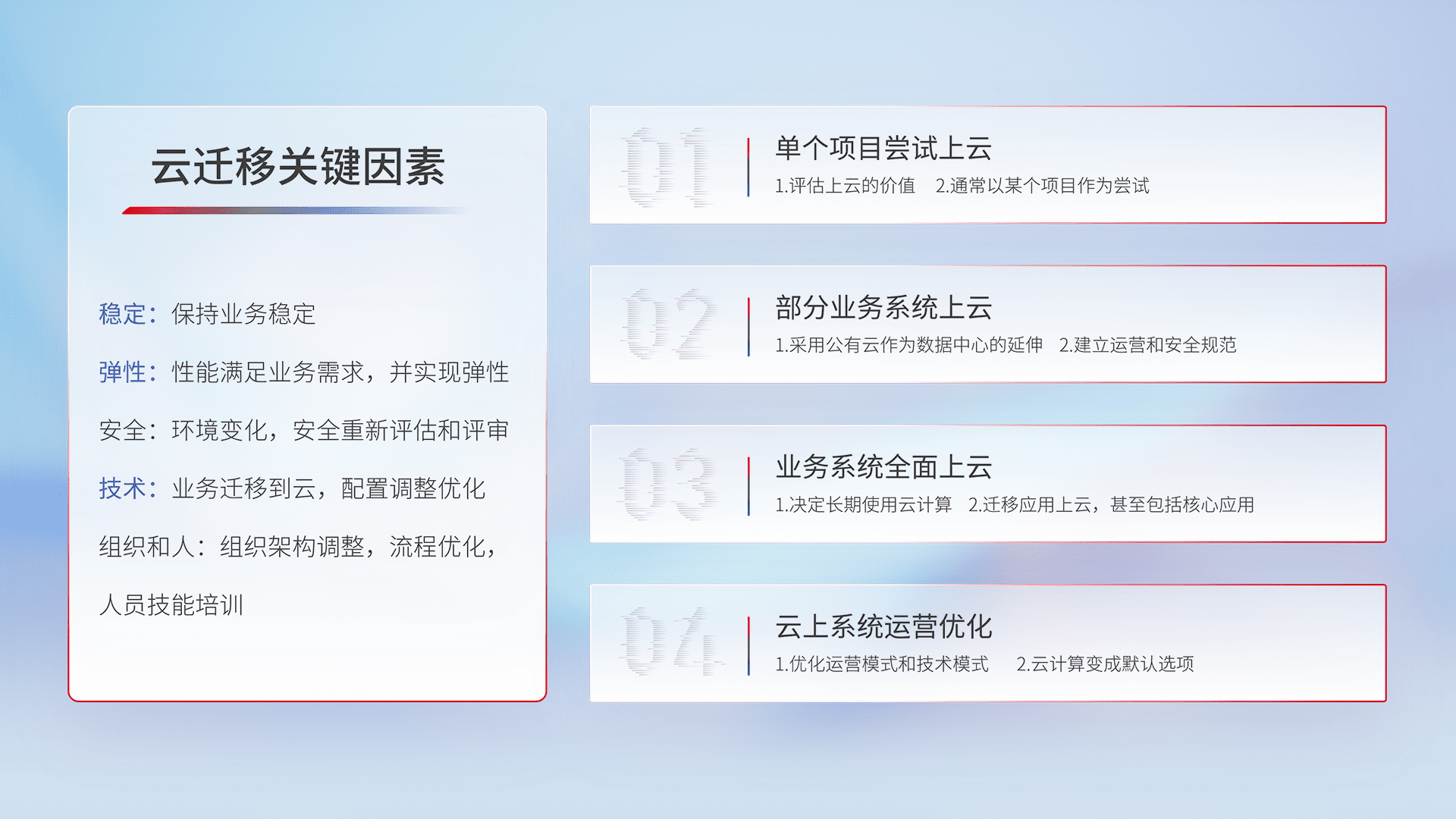 结合实际业务,,,从规划设计、、云平台选型、、、云原生改造、、、数据迁移、、、集成交付,,,,迁移全过程为客户识别最佳上云路径,,,,做好风险识别管理,,,,设计网络架构、、、身份权限、、、安全审计合规、、、、操作审计、、、、日志审计、、监控告警策略、、、多站点容灾设计等,,对云上基础设施进行整体规划,,提升IT治理水平,,,,以满足弹性、、高可用、、、、高性能的需求。。。