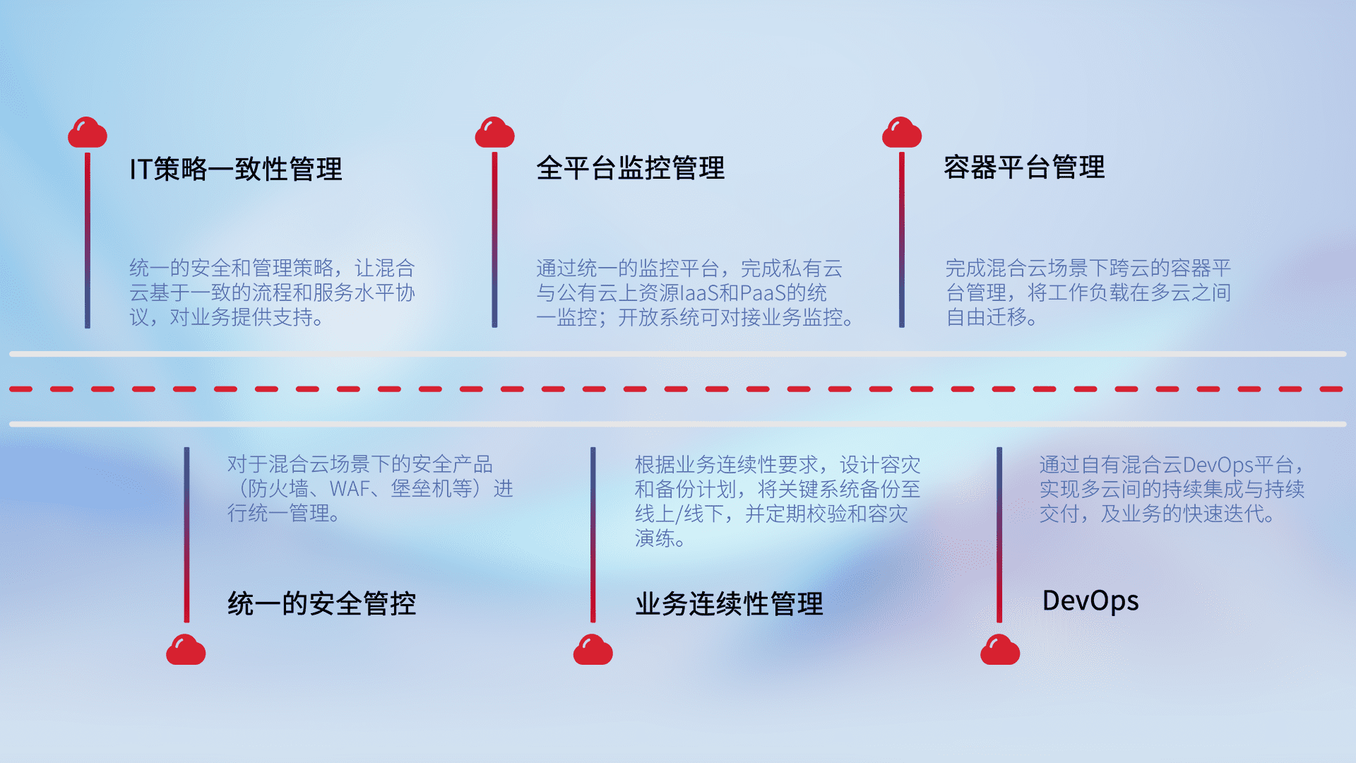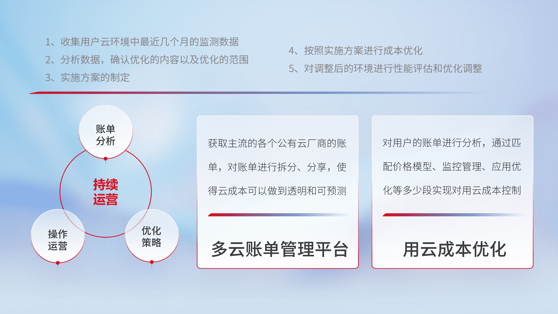 通过多云纳管,,,,以统一的资源数据模型把客户的云资源进行抽象和封装,,,,进而实现对多云资源的统一操作,,,,保障云资源管理的可靠性、、稳定性与可用性。。量身定制化运维内容,,配置、、、、开发运维、、、、补丁管理、、、、备份、、监控、、、、认证和访问管理、、审计和日常巡检等,,保障在用云过程中的可靠度,,,稳定度以及高可用率。。。